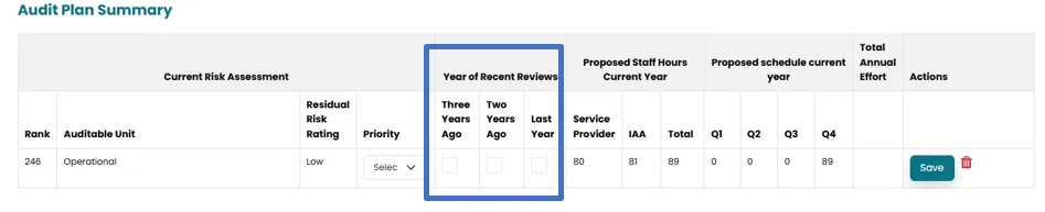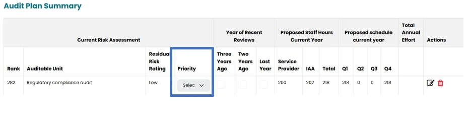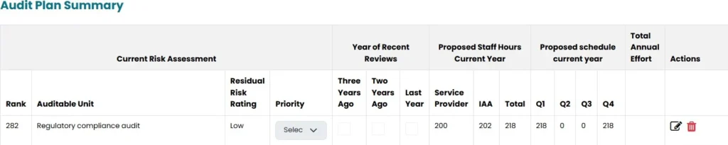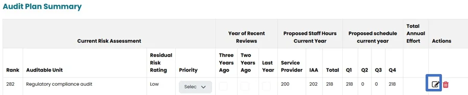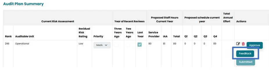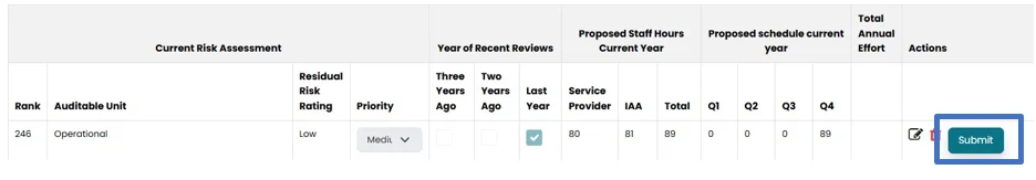 - Under this section, current risk assessment, proposed staff hours (current year), Proposed Schedule (current year) will be populated from the previous sections