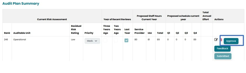 - By clicking on the submit button, an “Approve” button will appear in the Internal Audit Head’s account in the Audit plan summary section. The Internal Audit Head can review all the jobs and then “Approve”.