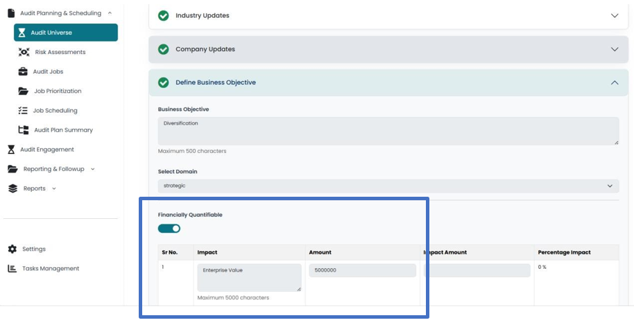 - Click on save button in order to populate the factors in Audit Universe section in User Account.