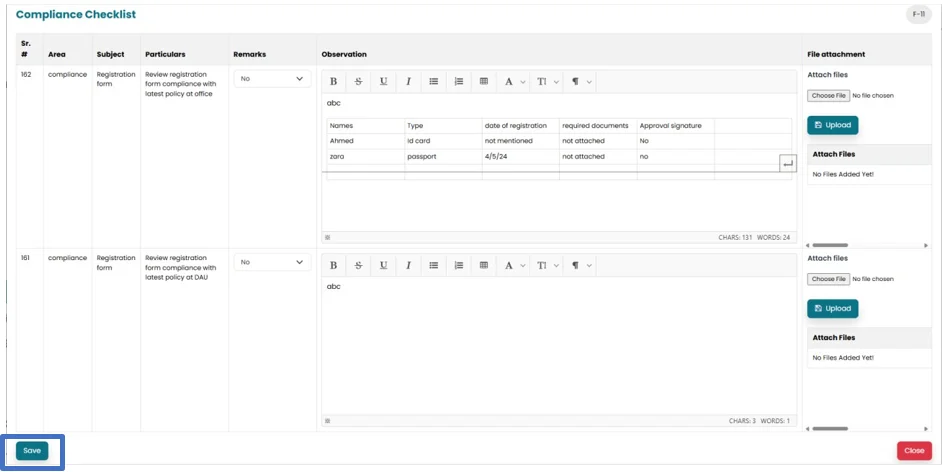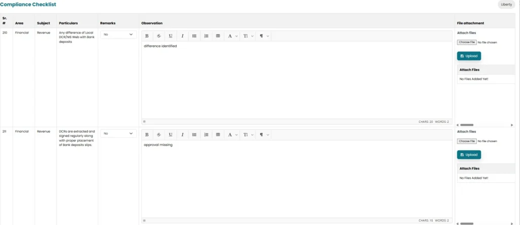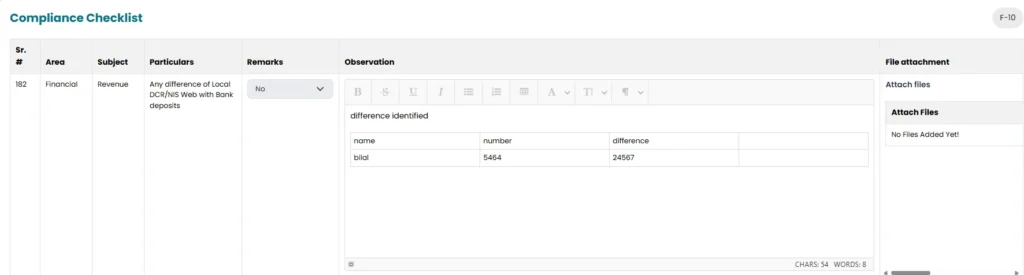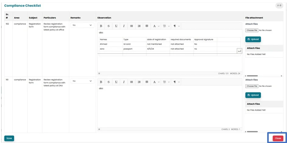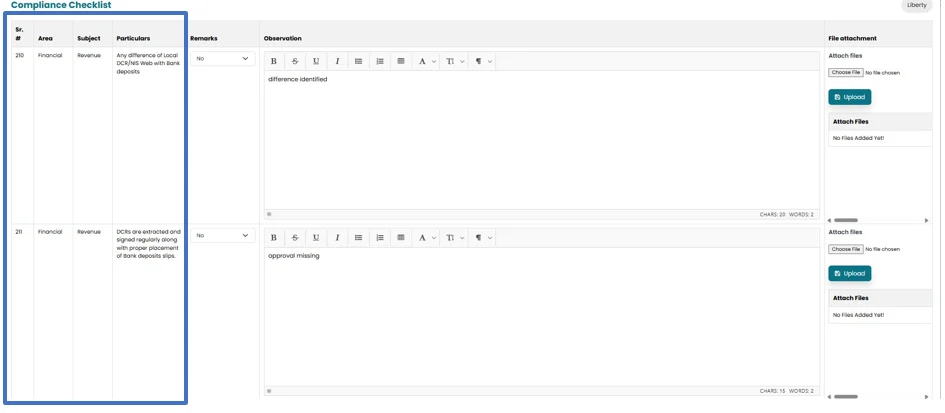 • System will fetch the area, subject and particulars from the pre saved checklist