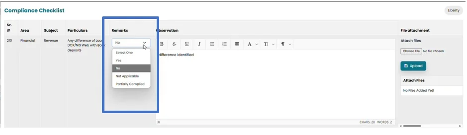 • Select one option from the drop-down list in remarks section including;