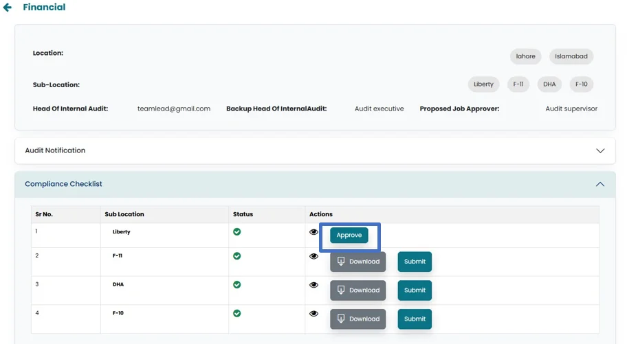 • After submission , an “Approve” button will appear in the Internal Audit Head’s account. The Internal Audit Head can review and then “Approve” the Compliance checklist.