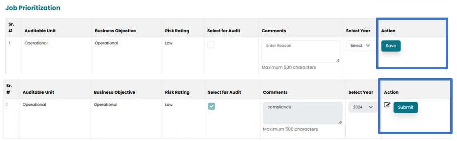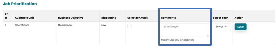 - Under this section, “Auditable Unit”,” Objective” and “Risk Rating” will be populated automatically from the previous sections.