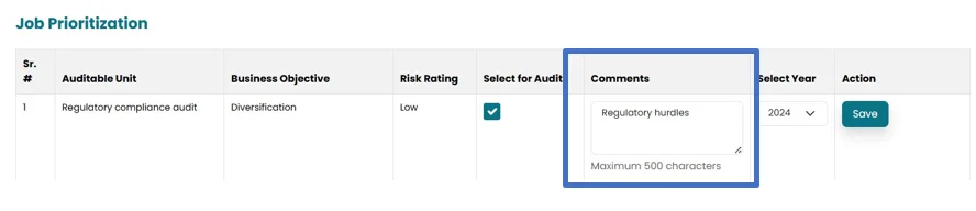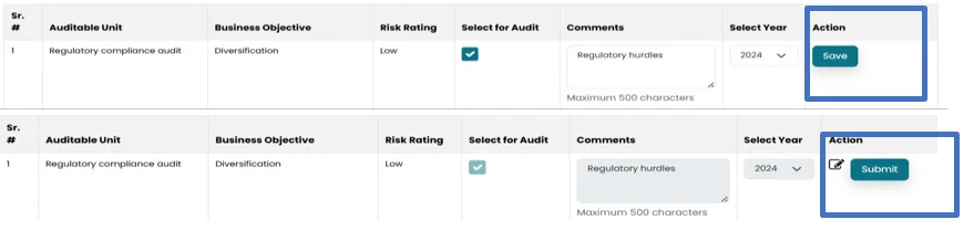 • Under this section, “Auditable Unit”,” Objective” and “Risk Rating” will be populated automatically from the previous sections.