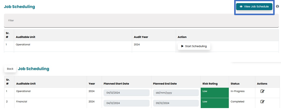 • By clicking on the “View Job Schedule” button, all the jobs along with ‘year’, ‘planned start date’, ‘planned end date’, ‘status’ and ‘risk rating’ can be viewed.