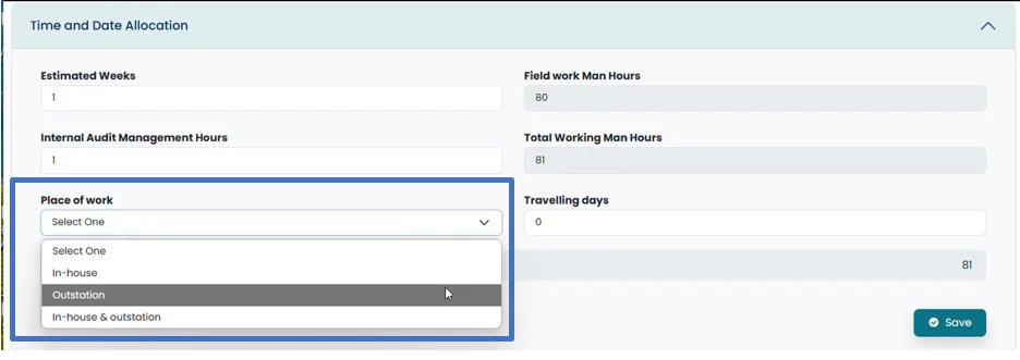 • Select the Place of work from the dropdown, choosing among “Inhouse”, “Outstation” or “Inhouse and Outstation”.