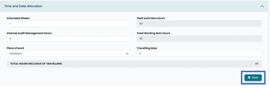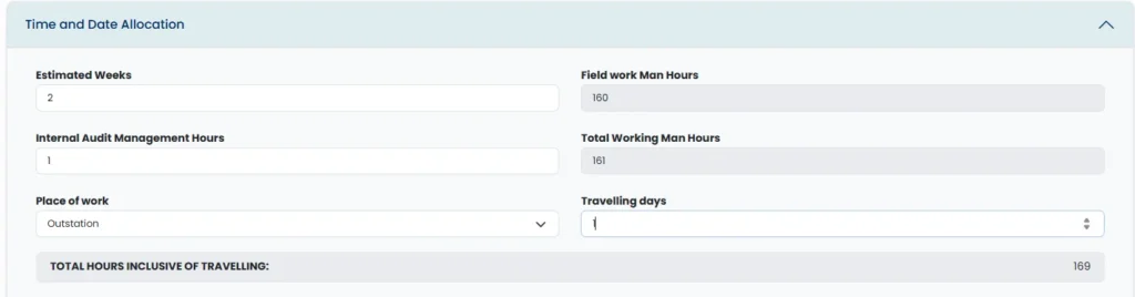 • In the “Time and Date allocation” section, indicate the number of estimated weeks necessary to complete the job. Each week comprises 40 hours. The system will automatically calculate the “Field Work Man Hours” based on the required resources and weeks.
