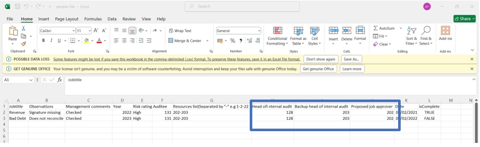 • Populate Head of internal audit, Back – up head of internal audit and Proposed Job Approver with their User Id.