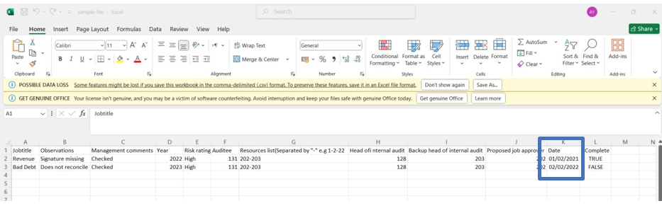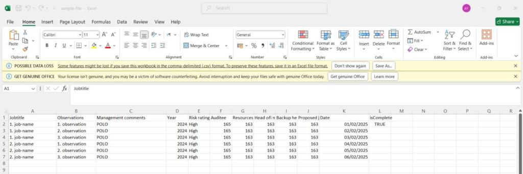 • Populate the area provided for Job Title, Observations, Management comments, Year of the observations and risk rating.