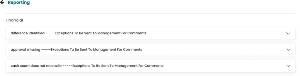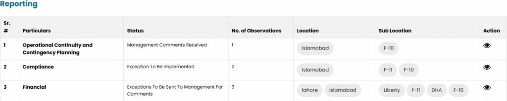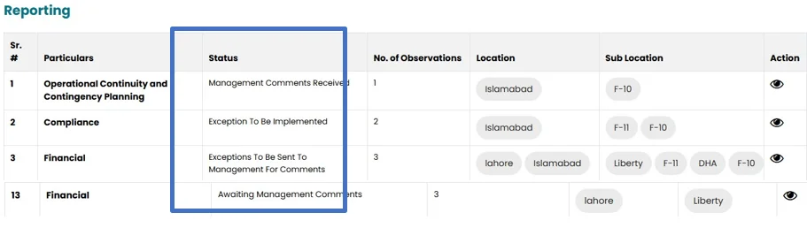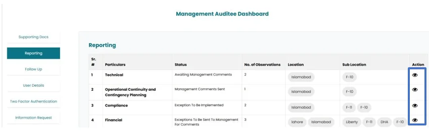 • Management can see the observation by clicking on reporting on the left side. Observation can be viewed by clicking on the view icon.