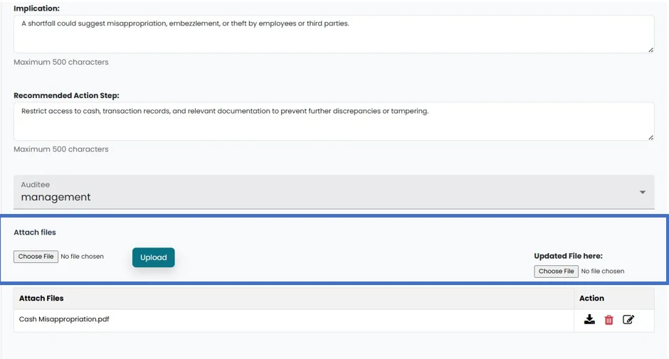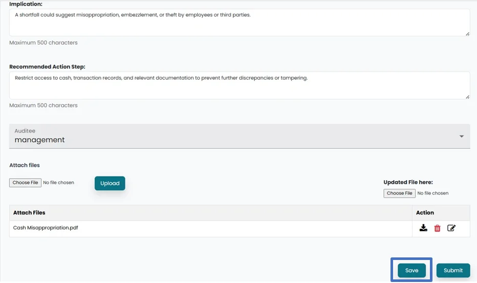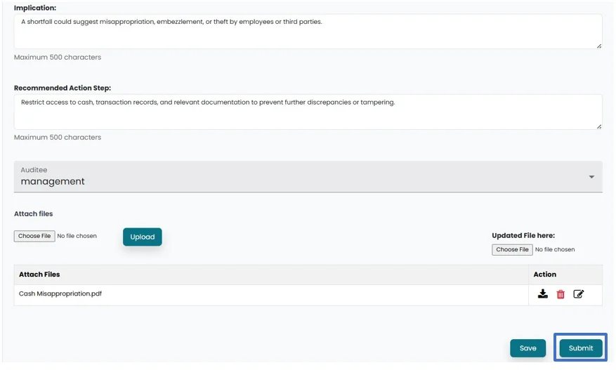 • Click on the “Submit” button to forward the progress to Head of Internal Audit.