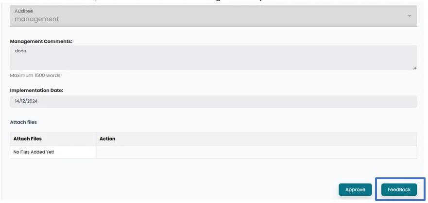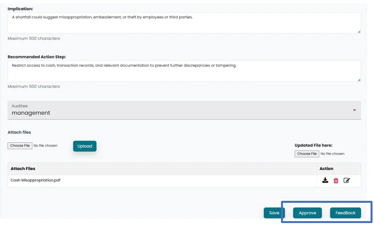 • After submission , an “Approve” and “Feedback” button will appear in the Internal Audit Head’s account. The Internal Audit Head can review and either provide feedback by clicking on feedback button or Approve by clicking on Approve button to “Approve” the Observation to be sent to management.