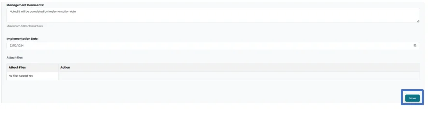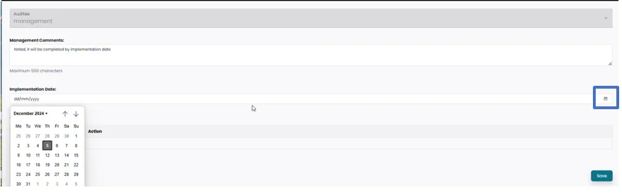 • Management can add their comment under Management comment section and select the implementation date by clicking on calendar icon.